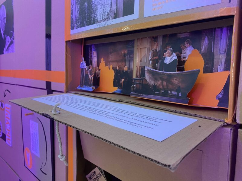 Каким бывает занавес? Как устроена сцена? Как звучит главная театральная примета? Ответ на каждый из этих — и на многие другие вопросы — предстоит в прямом смысле отыскать на выставке тверского ТЮЗа «Театральный словарь». Чтобы инсталляция ожила, зрителям предстоит открыть створки, покрутить табличку, подергать за ниточки и заглянуть внутрь картонного куба.