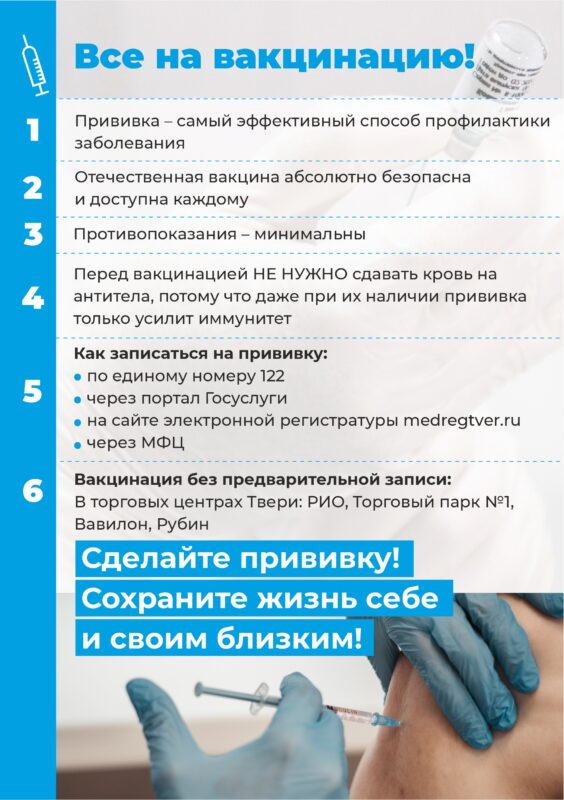 Без предварительной записи прививку можно сделать в торговых центрах Твери – ТЦ «РИО» на площади Гагарина, в Торговом парке №1 на Октябрьском проспекте, в ТЦ «Рубин» на проспекте Калинина и ТЦ «Вавилон» в фитнес-клубе «Атлетик Джим». Кабинеты там открыты по поручению губернатора Игоря Рудени для максимального удобства жителей – можно совместить важную для защиты своего здоровья вакцинацию с походом за необходимыми покупками.